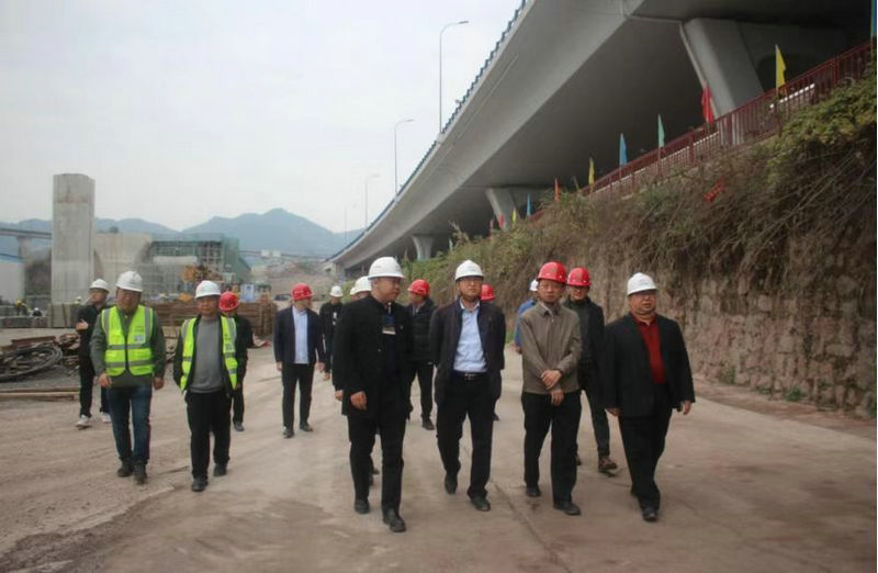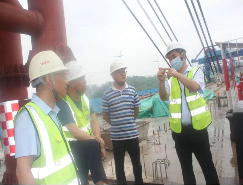 總承包部指揮長李兵(右1)、黨工委書記王向平(右3)、副指揮長陳華富(左2)在現(xiàn)場巡查督導(dǎo)