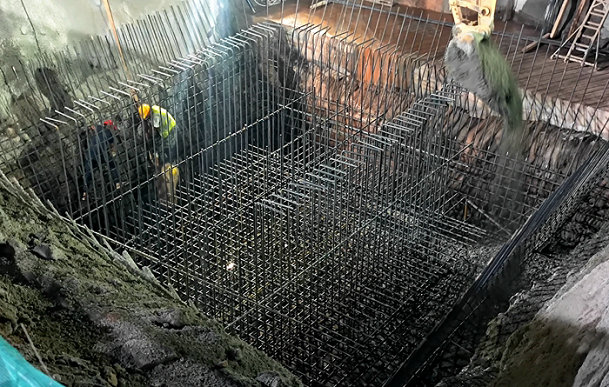 發(fā)電站最深處的集水井開挖成功后,進(jìn)入鋼筋網(wǎng)布設(shè)、澆注混凝土工序。在現(xiàn)場(chǎng)領(lǐng)導(dǎo)督導(dǎo)下,采用自卸車運(yùn)輸、鋼結(jié)構(gòu)儲(chǔ)存池與長(zhǎng)臂挖掘機(jī)靈活地傾倒混凝土辦法,合力完成長(zhǎng)8.7米、寬7米、高1.5米、125立方的集水井混凝土澆注任務(wù)。