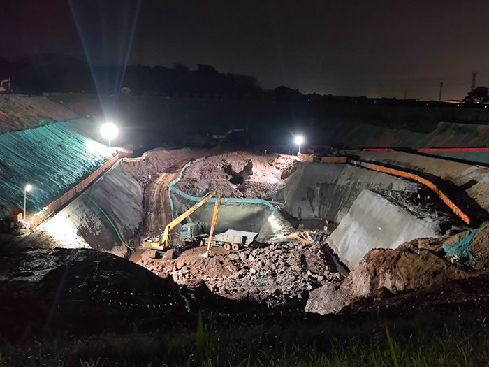 在施工中,該項(xiàng)目于今年4月份采取分層填筑、碾壓、鋪設(shè)土工布、鄰水面砌筑片石加固等辦法建設(shè)圍堰,利用區(qū)域內(nèi)40000多立方沙土和10000多立方片石建成一座高圍堰,經(jīng)受住了今年4次特大洪水的考驗(yàn)?;娱_挖觸底深度垂直30多米,挖掘機(jī)、破碎機(jī)炮擊由淺入深,越后面難度越大。地下水豐富,該項(xiàng)目部在兩側(cè)半腰建了一個(gè)流水槽攔截大涌水,將其匯聚到水井再外排,底部的涌水則由大型抽水機(jī)階梯式24小時(shí)接力外抽,保持工作面相對(duì)干燥?;釉酵峦?,塌方的幾率越高,項(xiàng)目部采取掛網(wǎng)噴錨的辦法遏制住了塌方。隨著開挖的深入,自卸車倒運(yùn)棄渣的難度漸漸增大,為解決這個(gè)問題,從出口延伸到底部一左一右兩條彎道很大的便道,一車車棄渣順利運(yùn)至棄渣場(chǎng)。
