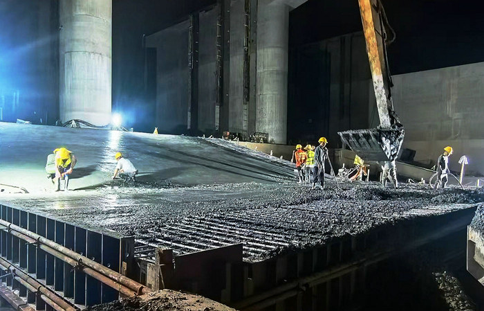 常山江航電樞紐就像人的“五官”,消力池是其中一個“器官”,從外到內(nèi)不能有瑕疵。在澆注混凝土?xí)r,項目部采取長臂挖掘機將自卸車傾倒進鋼結(jié)構(gòu)池的混凝土挖運至鋼筋網(wǎng)內(nèi),并由人工操持振動棒、抹子搗固密實、抹平。