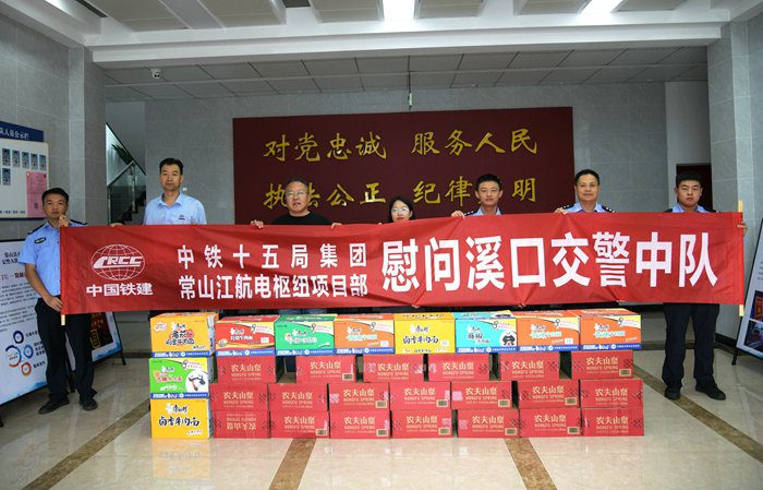 該項(xiàng)目管理團(tuán)隊(duì)承擔(dān)著錢塘江中上游(輝埠—雙港口)常山江一期常山段4座梯級(jí)樞紐、4座橋梁及配套設(shè)施,全長約33.4公里,工期6年,工程造價(jià)35.8億元。為了營造良好的施工環(huán)境,該項(xiàng)目部積極與常山縣公安、交通、國土、征拆辦及村鎮(zhèn)等政府部門和單位領(lǐng)導(dǎo)溝通交流,瞄準(zhǔn)項(xiàng)目安全質(zhì)量、工期環(huán)保、造福常山乃至浙江,實(shí)現(xiàn)企地合作共贏終端目標(biāo)開展工作。溪口交警中隊(duì)負(fù)責(zé)十五局二公司常山江航電樞紐項(xiàng)目交通管理,為施工生產(chǎn)保駕護(hù)航。在樞紐、大橋建設(shè)中,需要交通管制時(shí),一個(gè)電話,該中隊(duì)馬上派人上路指揮交通,疏導(dǎo)車輛行人安全通行,數(shù)九寒冬、高溫下,總會(huì)出現(xiàn)他們的身影,汗水濕透了衣裳,臉被火辣辣的太陽曬得黑黢黢的,卻毫無怨言。為了感謝溪口交警中隊(duì)官兵對(duì)常山江項(xiàng)目的支持幫助,建立企地友誼、加深理解和凝聚力量實(shí)現(xiàn)共同目標(biāo)、體現(xiàn)央企對(duì)地方政府的感激之意,項(xiàng)目部主管領(lǐng)導(dǎo)安排專人采購20件礦泉水、10箱泡面前去慰問。
