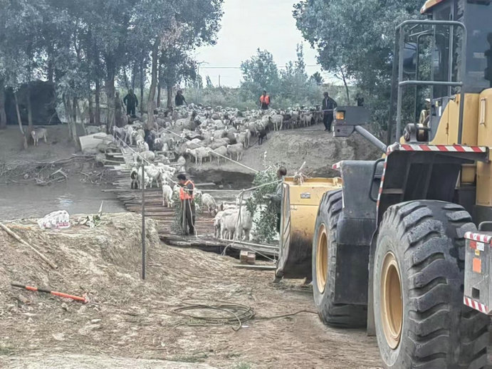 針對現(xiàn)場情況,項目調配了兩臺裝載機、一輛運輸車、一輛挖掘機調運土方、填筑河道。項目部青年志愿者們堅守在一線,充分發(fā)揚不畏艱難險阻的精神,不間斷觀察現(xiàn)場情況,實時掌握設備運行狀態(tài),選擇水流較緩的區(qū)域進行吊橋搭設,并對易被破壞風險部位時刻關注,嚴防吊橋受外力破壞。由于水流湍急,土方無法填筑形成安全通道。持續(xù)到下午17時許,洪水水位下降,救援團隊抓住寶貴時機,迅速安排挖掘機搭設臨時吊橋1座。隨著吊橋搭建逐漸穩(wěn)固,被困牧民在救援人員的協(xié)助下小心翼翼地帶著羊群來到安全地帶。