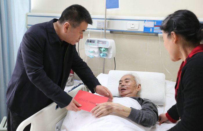 2019年春節(jié)即將到來之際,中鐵二十一局三公司對建國前入黨的老黨員進行慰問,為他們送去公司黨組織的關(guān)懷和溫曖。圖為公司黨委副書記、紀委書記郝禮到醫(yī)院看望91歲的老黨員盧長貴同志,并送上慰問金。 記者 尹登明 攝