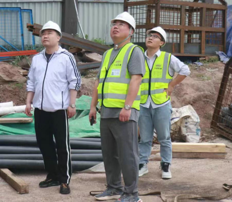 總承包部指揮長李兵(左1)、黨工委書記王向平(右1)在現(xiàn)場巡查督導(dǎo)工作