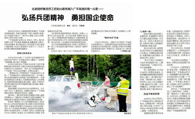 廣元訊(通訊員 馬軼鋒)11月19日,兵團(tuán)十一師黨委機關(guān)報《天山建設(shè)報》在一、三版刊載《弘揚兵團(tuán)精神、勇?lián)鷩笫姑吠ㄓ?,以發(fā)生在廣平高速上的5個貼心服務(wù)、助民救民感人事例展現(xiàn)了廣平高速在沿線群眾中的良好“口碑”、北新路橋在履行社會責(zé)任中的國企擔(dān)當(dāng)、兵團(tuán)精神隨路橋延伸的不斷傳播和踐行。