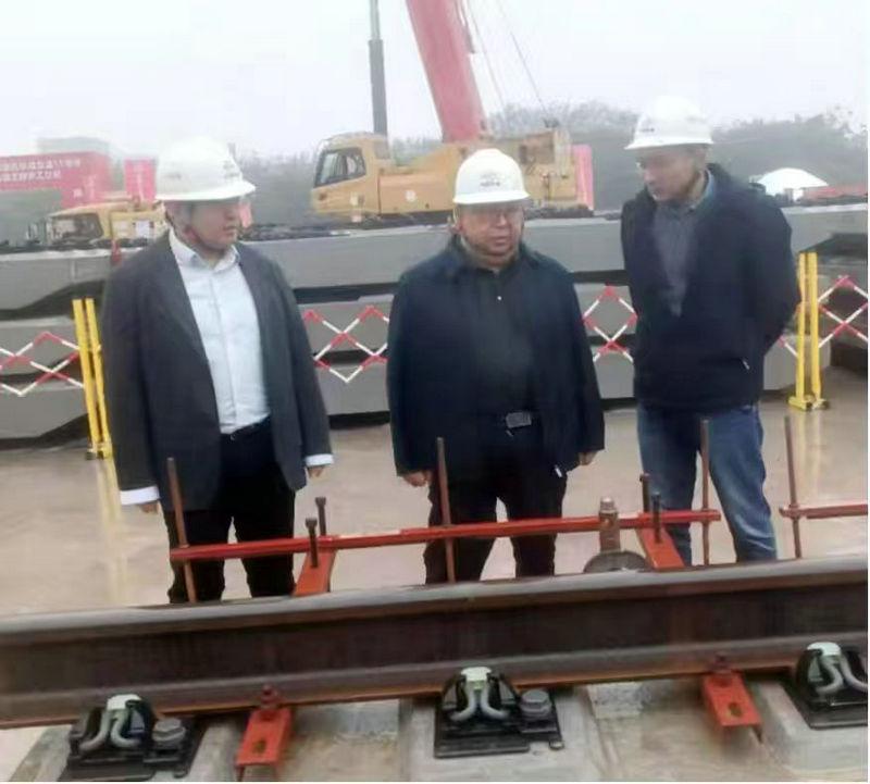 總承包部指揮長李兵(左2)與19標(biāo)項目軌道工程負責(zé)人徐新明(左1)、項目經(jīng)理王磊(右1)在鋪軌現(xiàn)場檢查