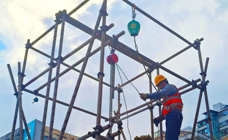 該項(xiàng)目施工區(qū)域位于巫山縣神女大道,地處中心地帶,施工現(xiàn)場(chǎng)地下管密布,部分地段施工落差較大,有限空間作業(yè)對(duì)施工的影響尤為明顯。而手拉葫蘆的應(yīng)用,解決了這一難題。