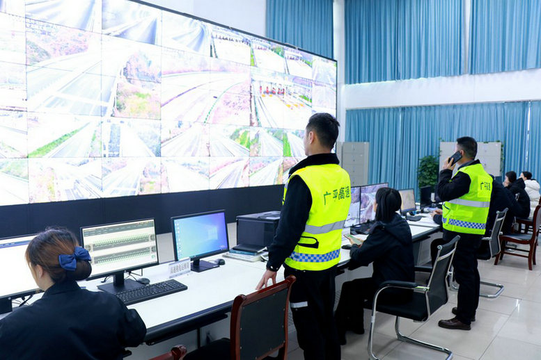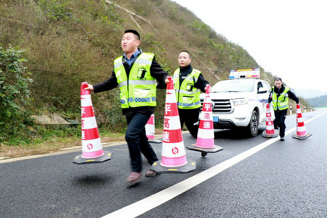 接到報警電話后,廣平高速監(jiān)控中心立即調(diào)出事故現(xiàn)場畫面,經(jīng)初步研判后啟動應急處置預案;“一路三方”值班領導迅速到達監(jiān)控中心聯(lián)合指揮,封控、救援、清障等應急力量緊急向事故現(xiàn)場開進。封控小組先行一步,臨時封閉高速入口,在事故現(xiàn)場后方設置警示標志,為后續(xù)行動留下安全空間;救援小組按照“先人、再車、后設施”順序,檢查人員傷亡和車輛、路面設施受損情況,做好現(xiàn)場應急處理和后送醫(yī)院準備;清障小組到達后,拖走事故車輛,人工與機械結(jié)合清理路面積雪結(jié)冰、布撒融雪劑,維修護欄。