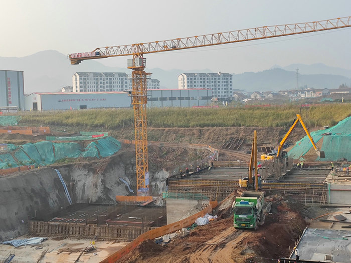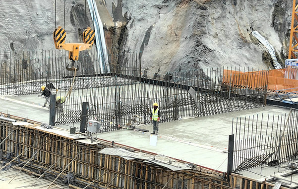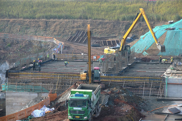 今年5月初,抵御汛期洪峰沖擊的二期圍堰順利建成,使電站廠房施工得以如期進(jìn)行。開挖基礎(chǔ)采取挖掘機(jī)挖、大功率破碎頭炮擊、自卸車、鏟車等多臺設(shè)備聯(lián)合作戰(zhàn)的辦法,由淺入深、從小范圍到大規(guī)模,從掛網(wǎng)噴錨支護(hù)高邊坡到修渠、埋管排水,再到修便道外運(yùn)棄渣、觸底布網(wǎng)和澆注混凝土,每一步推進(jìn)都在計(jì)劃之內(nèi)。