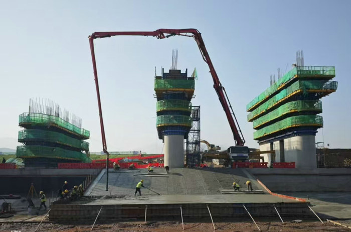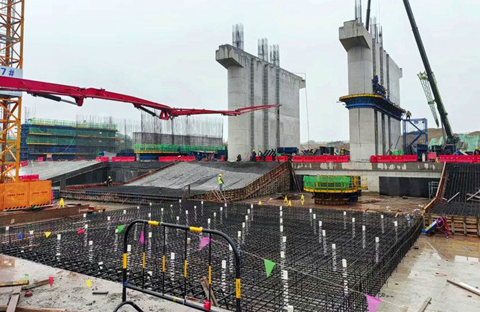 在泄洪閘、導(dǎo)流墻基礎(chǔ)開(kāi)挖中,該項(xiàng)目采取大功率破碎錘炮擊、挖掘機(jī)深挖、渣土車轉(zhuǎn)運(yùn)的“一條龍”流水作業(yè),使河道2米表層以下的碎巖在強(qiáng)大的機(jī)械掘進(jìn)中由強(qiáng)變?nèi)酰匀站?000多立方的速度向下、向縱橫穩(wěn)步推進(jìn),深達(dá)6米多的泄洪閘、導(dǎo)流墻槽型基坑,兩個(gè)月時(shí)間便展現(xiàn)在面前。緊接著澆注泄洪閘、導(dǎo)流墻混凝土首層、綁扎鋼筋網(wǎng)并灌注首倉(cāng)底板,閘墩首節(jié)和上部布網(wǎng)、安裝模具、灌注混凝土,完成一個(gè)閘墩,將模具拆下來(lái)用于另一個(gè)閘墩作業(yè)。第一個(gè)閘墩順利完成每一道工序,為下一個(gè)閘墩以及導(dǎo)流墻鋼筋混凝土施工提供了可復(fù)制的施工經(jīng)驗(yàn),依次完成一個(gè)又一個(gè)閘墩,直到第4個(gè)澆注完畢。