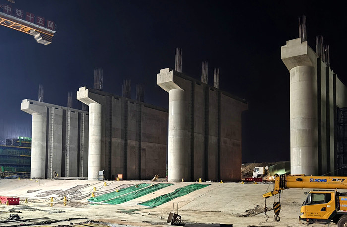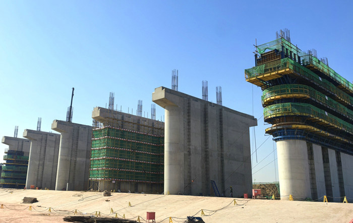在泄洪閘底板、消力池基礎(chǔ)施工中,該項(xiàng)目動用多臺破碎錘炮擊、挖掘機(jī)與渣土車裝運(yùn),堅(jiān)硬的碎巖、泥巖,從掘進(jìn)深度1米到10多米,一點(diǎn)點(diǎn)攻克,并向縱橫拓展,符合澆注第一層混凝土條件時,分倉完成底板、消力池首層“打底”,然后布設(shè)縱橫交錯的鋼筋網(wǎng)、從首倉到末倉依次澆注混凝土。他們采取底板與消力池同步施工,利用長臂挖掘機(jī)灌注或罐車與泵車配合作業(yè)的辦法,待上一倉混凝土強(qiáng)度達(dá)標(biāo),進(jìn)入下一倉安裝模具、布網(wǎng)、澆注程序,依次推進(jìn),確保了施工進(jìn)度。