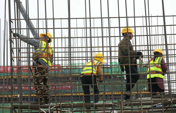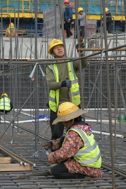 工人在綁扎鋼筋籠 贠煥軍攝