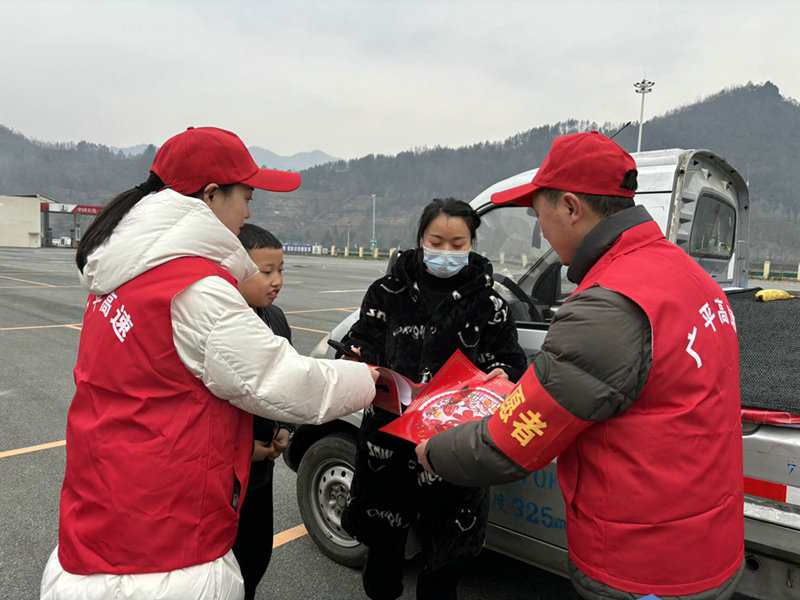 來到設置在服務區(qū)樓前的便民服務點,“暖冬行動、情滿旅途”橫幅高高懸掛,桌上擺放熱飲、小地產等和由春聯、窗花、福字等組成的新年大禮包,志愿者笑臉相迎、熱情服務。“天氣冷,請喝杯熱茶暖暖身子”,廣平高速運營中心的志愿者在遞上熱茶的同時也在傳遞社會的溫暖。“高速行駛要注意安全,祝您旅途順利”,來自高速公安的志愿者發(fā)出溫馨提示。“送您一份‘大禮包’,提前祝您和家人新年快樂”,高速執(zhí)法志愿者誠摯的祝福讓旅客消除了長途的疲憊。