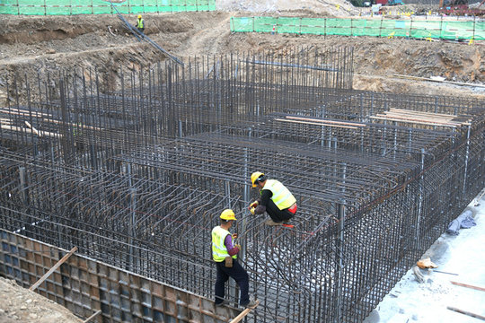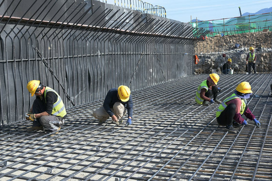 工人精心綁扎鋼筋網(wǎng) 孫立斌攝