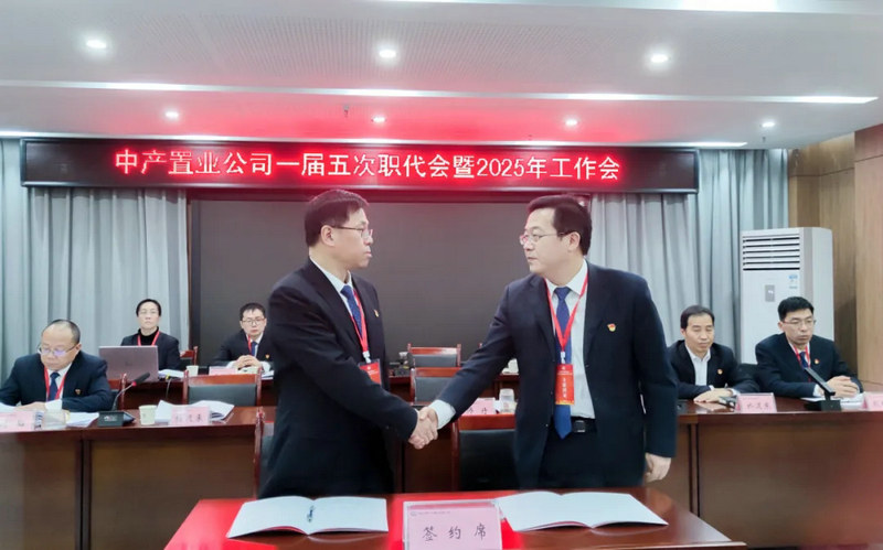 中鐵中產置業(yè)公司黨委副書記、紀委書記梅道來主持會議。會議聽取了《中鐵中產置業(yè)有限公司2024年度財務工作報告》、《中鐵中產置業(yè)有限公司“十四五”2024年度發(fā)展規(guī)劃執(zhí)行情況報告》,公布了票決結果,通過了《中鐵中產置業(yè)有限公司2024年“五險二金”繳納和管理情況報告》、《中鐵中產置業(yè)有限公司關于一屆四次職代會提案處理和一屆五次職代會提案征集情況的報告》、關于中鐵中產置業(yè)有限公司《2024年集體合同》履行情況和《2025年集體合同》(草案)文本起草情況的報告、《中鐵中產置業(yè)有限公司2025年集體合同》(草案),師丹和梅道來分別代表公司方和職工方簽訂了《2025年集體合同》。