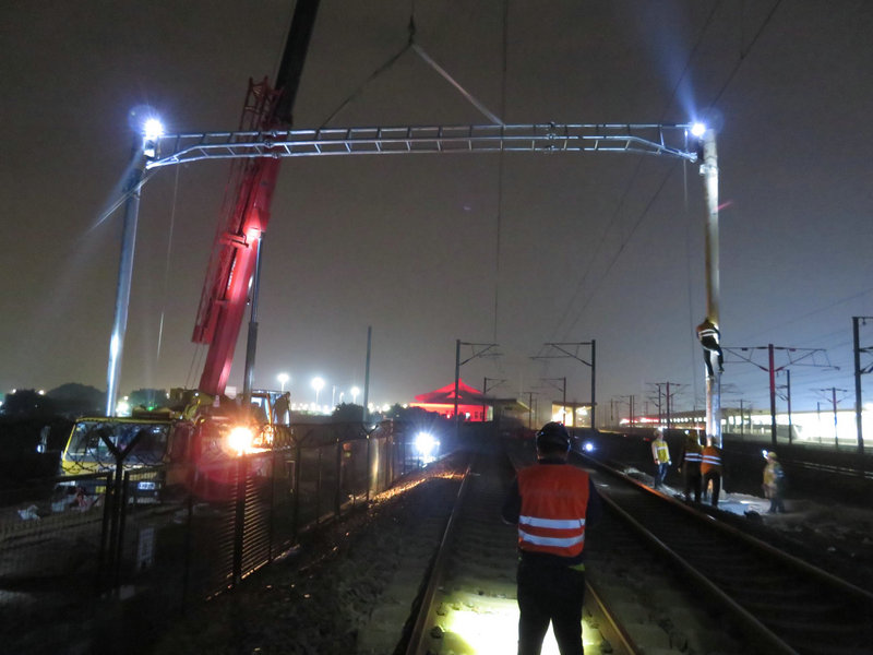 從施工準(zhǔn)備,班前點(diǎn)名,接到封鎖停電命令后,大家進(jìn)場(chǎng)進(jìn)行驗(yàn)電接地,頃刻間施工現(xiàn)場(chǎng)人影攢動(dòng),安全帽及防護(hù)服身上的反光條在燈光的照耀下,成為夜色中最為明亮的標(biāo)識(shí)。接觸網(wǎng)第二架子隊(duì)全員腳踏實(shí)地,在確保施工質(zhì)量和安全的前提下,搶進(jìn)度、趕工期,從凌晨12點(diǎn)到2:40,在電氣化項(xiàng)目部安全總監(jiān)金加?xùn)|、安質(zhì)部副部長(zhǎng)潘果果的盯控下,現(xiàn)場(chǎng)管理人員與施工人員齊心協(xié)力,爭(zhēng)分奪秒,經(jīng)過了兩個(gè)多小時(shí)的施工,完成接觸網(wǎng)支柱組立2根,硬橫梁架設(shè)1組,PW線肩架安裝1套,支柱打孔101#、104#各4個(gè),拉線安裝4根,架設(shè)6-40#至134#間過渡PW線530米,安裝下錨底座2套。在有限的時(shí)間內(nèi)順利完成了本次天窗施工任務(wù)。施工完畢后,安全防護(hù)員對(duì)現(xiàn)場(chǎng)內(nèi)外進(jìn)行仔細(xì)檢查確認(rèn),對(duì)施工廢棄物、遺留工具或垃圾及時(shí)清理干凈,組織人員安全撤出,為本次天窗施工畫上圓滿的句號(hào)。