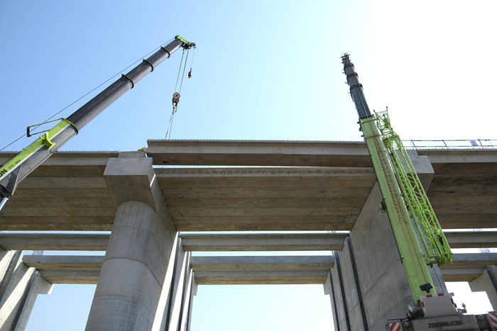 鐵路工程建設(shè)網(wǎng)訊 3月24日上午9點50分,兩臺60噸汽車吊在人力配合下,合力將最后一片23噸的空心板梁高高舉起,然后緩緩地安放在中鐵十五局常山江航電招賢樞紐泄洪閘6—7號閘墩上,宣告第一階段架梁架梁結(jié)束。