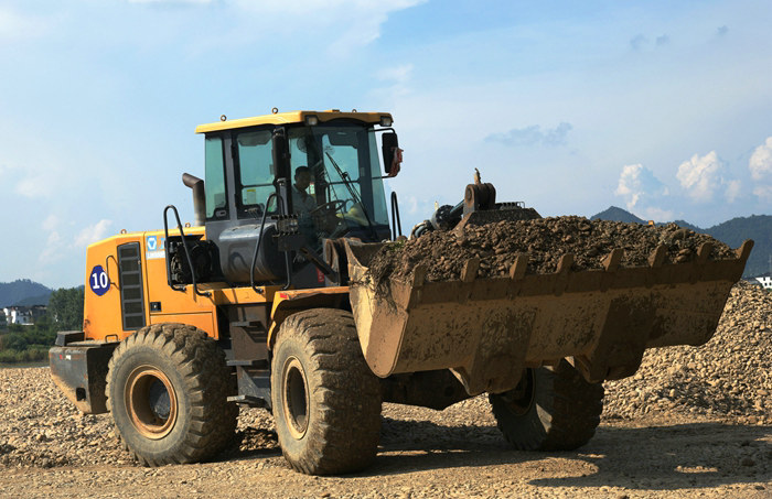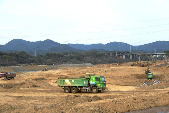鏟車往電站圍堰運(yùn)輸泥沙石 郝偉亮攝