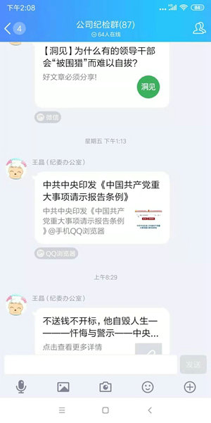 兼職人員誦好“三日經(jīng)”。為加強所屬各單位專兼職紀(jì)檢監(jiān)察人員的教育和培訓(xùn),利用qq群和微信群發(fā)送學(xué)習(xí)內(nèi)容、上傳廉政規(guī)定、提出廉潔要求、上好廉政黨課、加強廉潔教育。每三日發(fā)送一次,現(xiàn)已發(fā)送131期。各單位紀(jì)檢監(jiān)察員在誦好“三日經(jīng)”的同時,還將內(nèi)容及時轉(zhuǎn)發(fā)到本單位qq群和微信群中,讓全體黨員群眾認(rèn)真學(xué)習(xí)有關(guān)規(guī)定和廉潔知識,做到了“手機在手,廉潔警示教育隨時有”。