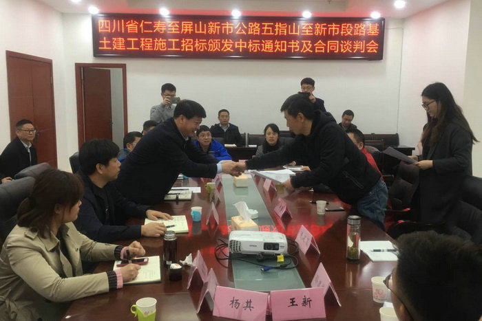 圖為中鐵二十一局三公司董事長莊乾理(左)喜領(lǐng)中標(biāo)通知書由中鐵二十一局三公司承建的仁沐新高速公路LJ16標(biāo)段,位于四川省屏山縣中都鎮(zhèn),線路全長6.434Km,項目投資6.925億元。設(shè)計為雙向四車道高速公路,行車速度80km/h,設(shè)計荷載公路-I級,路基寬度整體式25.5m,分離式16m,隧道凈高5米、寬10.25米。