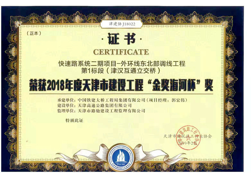 近日,中國鐵建大橋工程局集團(tuán)三公司天津外環(huán)項(xiàng)目領(lǐng)取了天津市建筑施工行業(yè)協(xié)會頒發(fā)的2018年度天津市建設(shè)工程“金獎海河杯”,這是三公司首次獲得這一獎項(xiàng)。