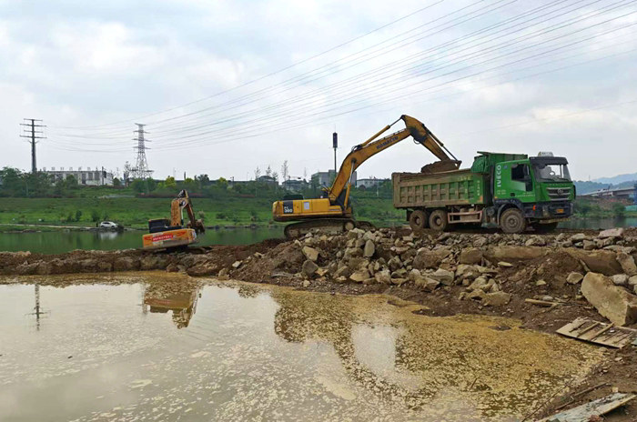 晚飯后,突擊隊員再次直奔現場完成圍堰加厚、加高任務,經過近10個小時的艱苦奮戰(zhàn),圍堰加高兩米多,暴漲的洪水無無法撼動圍堰,無一處潰堤。其次,動用多臺大功率抽水設備對圍堰內的大量積水外排,為晴天施工創(chuàng)造條件。