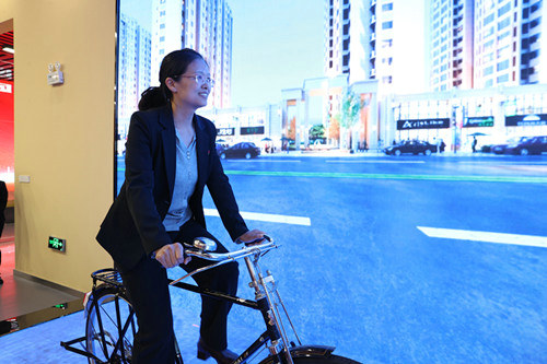黨員張紅梅還騎上“二八”大杠自行車,體驗(yàn)穿越時(shí)空的感覺。隨著車輪轉(zhuǎn)動(dòng),自行車側(cè)面屏幕呈現(xiàn)出從戈壁荒漠到現(xiàn)代化兵團(tuán)城鎮(zhèn)的美景,她為兵團(tuán)取得的偉大成就感到特別驕傲和自豪。