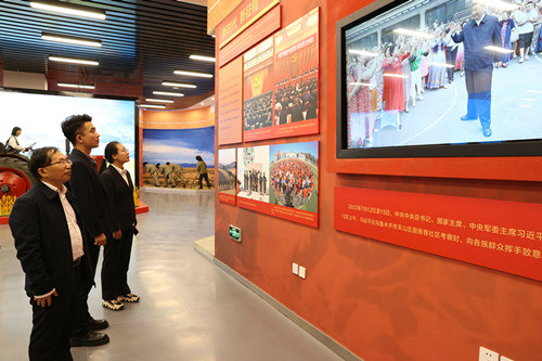 在講解員的帶領(lǐng)下,全體人員參觀了“軍墾之星”數(shù)創(chuàng)基地北大廳兵團(tuán)紅色文化等展區(qū),通過借助文物、圖片、展板、多媒體屏幕等媒介,用動(dòng)畫話兵團(tuán)、沙畫繪兵團(tuán)、電影講兵團(tuán)、紀(jì)錄片述兵團(tuán)了解歷史文物蘊(yùn)含的兵團(tuán)精神,感受老一輩兵團(tuán)人屯墾戍邊的崢嶸歲月。