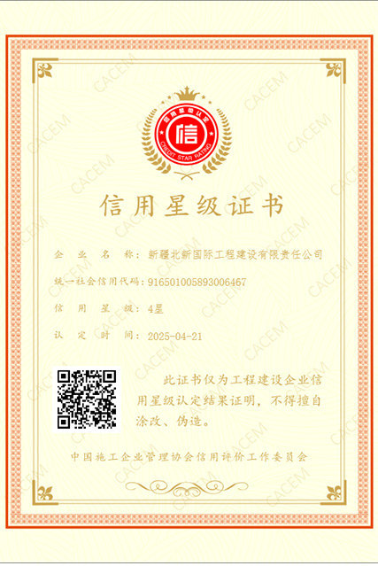 北京訊(通訊員羅鵬程)近日,中國(guó)施工企業(yè)管理協(xié)會(huì)正式發(fā)布新年度工程建設(shè)企業(yè)信用星級(jí)認(rèn)定結(jié)果,新疆兵團(tuán)建工北新國(guó)際憑借卓越的企業(yè)信用表現(xiàn)和扎實(shí)的工程履約能力,從三星級(jí)成功晉升為四星級(jí)信用企業(yè)。本次成功晉級(jí),既是對(duì)公司多年來(lái)誠(chéng)信經(jīng)營(yíng)、規(guī)范管理的高度認(rèn)可,更是對(duì)我司“誠(chéng)信立企、質(zhì)量強(qiáng)企”發(fā)展理念的充分肯定,標(biāo)志著我司企業(yè)信用體系建設(shè)取得了新的成效。