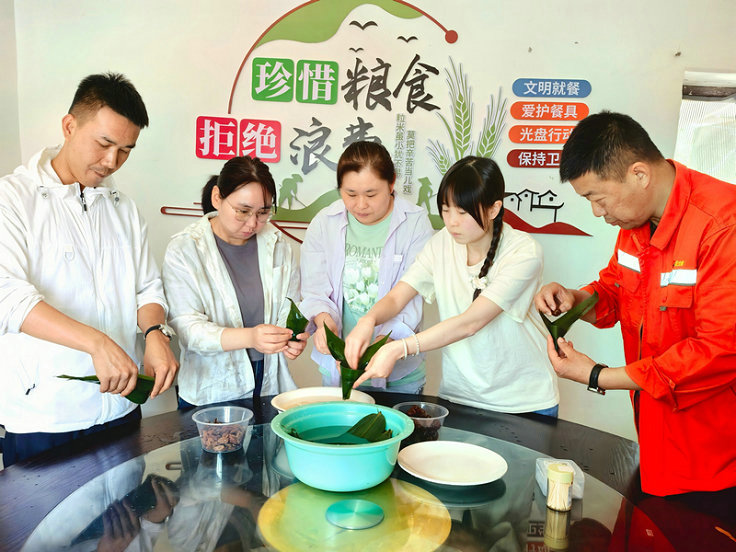 “大家快來(lái)參加活動(dòng),一起包粽子,今天的游戲環(huán)節(jié)豐富多彩,樂(lè)趣多多……”一片片清香的粽葉、一粒粒飽滿的糯米、一顆顆晶瑩剔透的蜜棗、一條條五彩的麻繩……在活動(dòng)開(kāi)始前,包粽子的材料已整整齊齊擺放在活動(dòng)會(huì)場(chǎng)的桌子上,幾位經(jīng)驗(yàn)豐富的職工率先示范包粽子的技巧,從折疊粽葉、填充糯米到系繩固定,每一個(gè)步驟都講解得細(xì)致入微。現(xiàn)場(chǎng)氣氛愈發(fā)濃烈大家當(dāng)即分成小組,一邊相互交流學(xué)習(xí),一邊動(dòng)手實(shí)踐。大家不僅掌握了基本技巧,還包出了一個(gè)個(gè)形狀各異、充滿創(chuàng)意的粽子,現(xiàn)場(chǎng)笑聲不斷,其樂(lè)融融,并將粽子煮熟一同分享勞動(dòng)成果。