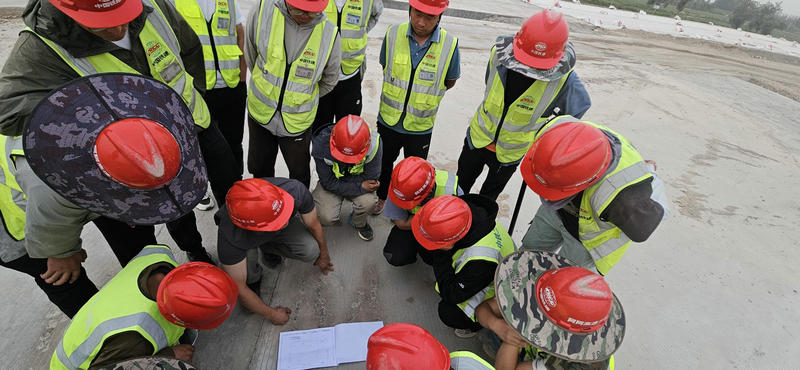 理論沉一線,破解技術(shù)堵點(diǎn)。項(xiàng)目將課堂搬到施工前沿,開展“圖紙+現(xiàn)場+問題”三位一體教學(xué)。在橋涵過渡段,技術(shù)負(fù)責(zé)人演示“壓實(shí)度分層測(cè)控法”,精準(zhǔn)控制攤鋪與碾壓參數(shù),消除“橋頭跳車”隱患;路面作業(yè)區(qū)里,技術(shù)人員邊學(xué)水穩(wěn)層配比理論,邊實(shí)操攤鋪校準(zhǔn)與碾壓調(diào)試,掌握“毫米級(jí)”精度;塔里木河特大橋現(xiàn)場,技術(shù)人員認(rèn)真記錄要點(diǎn),形成“學(xué)、看、解”閉環(huán)。