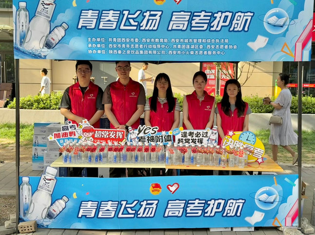 早晨7點,西安公司的青年志愿者們已早早來到西安市第十中學考點,搭建帳篷,擺放桌椅、物資,確保第一批到考場的考生就能喝上清涼的水,用實際行動為高考學子圓夢之路“保駕護航”。