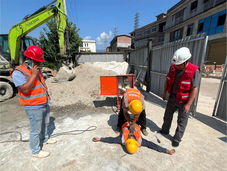 演練現場模擬了工人在進行充電樁電纜敷設作業(yè)時,因電纜外皮老化破損,不慎觸電倒地的緊急情況。事故發(fā)生瞬間,現場安全員迅速反應,一邊高喊“別靠近,危險!”,一邊抄起絕緣橡膠棒,僅用10秒就挑開了纏繞在傷者身上的帶電電纜,隨即切斷總電源,并通過對講機向項目部報告:“A區(qū)配電房有人觸電,已斷電,請求支援!”
