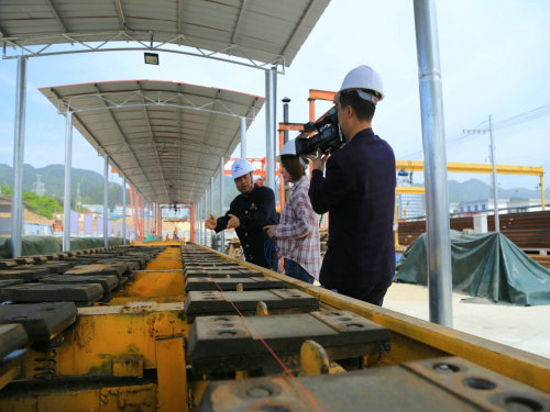 當天上午,記者一行首先來到了項目部鋪架基地生產(chǎn)區(qū)。在現(xiàn)場,記者們先后詢問了鋪軌釘聯(lián)生產(chǎn)流程、長軌鋪設施工工藝、500米長軌存放及施工工器具種類等系列問題。項目部常務副經(jīng)理劉超紅對記者們所提出的問題進行了一一解答。隨后,記者們對項目部各生產(chǎn)功能性區(qū)域進行了拍攝。