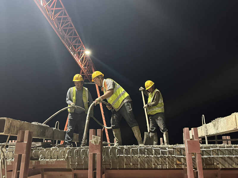 在施工過程中,項(xiàng)目團(tuán)隊(duì)為了確?;炷镣庥^及強(qiáng)度達(dá)標(biāo),運(yùn)用了整體鋼模、附著式聯(lián)合振搗以及“棉被溫室+噴淋”養(yǎng)護(hù)體系。同時(shí),項(xiàng)目部嚴(yán)格執(zhí)行“首件制”管理,施工前組織了方案評審,對鋼筋下料、模板拼裝、張拉壓漿等關(guān)鍵工序進(jìn)行了詳細(xì)交底,而且作業(yè)人員都通過了技能考核?,F(xiàn)場還配備了夜間照明、車輛指揮、防暑降溫等措施,保障了安全、質(zhì)量、進(jìn)度同步受控。?