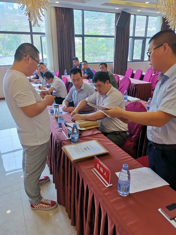圖為供應(yīng)商向評委遞交招標(biāo)文件 據(jù)了解,仁沐新高速公路LJ16標(biāo)項目部共需采購彩鋼房5000平方米、輕鋼料棚1.77萬平方米、全封閉圍擋9000平方米,共需700多萬元。通過各供應(yīng)商報價、產(chǎn)品質(zhì)量、評標(biāo)篩選打分,項目部優(yōu)中選優(yōu),擬確定兩家供應(yīng)商為中標(biāo)單位。