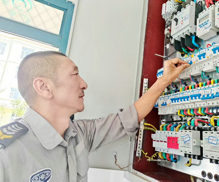 圖5為:保安員楊景江,正在檢修院內(nèi)供電線路。