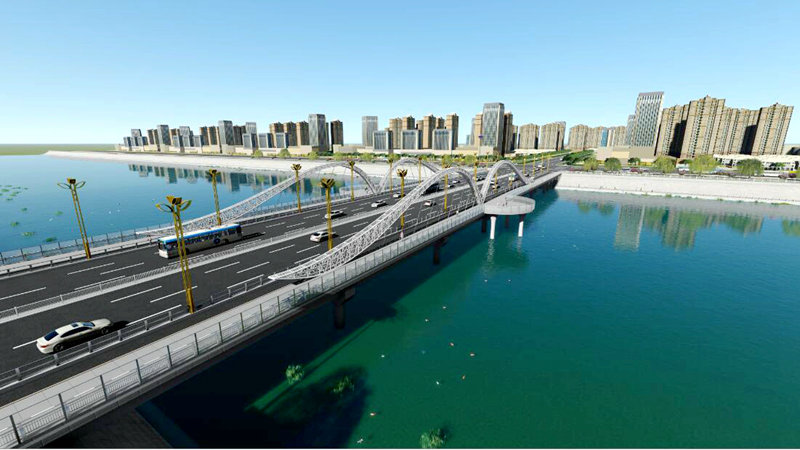 崇文街大橋工程,位于福山區(qū)崇文街與河濱路交叉口,東起河濱東路,西至河濱路,全長216米、寬45米,采用雙向八車道布置,設(shè)計(jì)時(shí)速50公里每小時(shí),工程計(jì)劃投資約5300萬元。橋梁設(shè)計(jì)圍繞 “飛鳥”這一特色主題,造型采用雙飛燕式異形拱為裝飾結(jié)構(gòu),橋梁形似一只展翅飛鳥遨游河邊,結(jié)合周邊碧水晴空的自然景觀,寓意未來的和諧環(huán)境,彰顯“福山飛躍”的美好寓意。