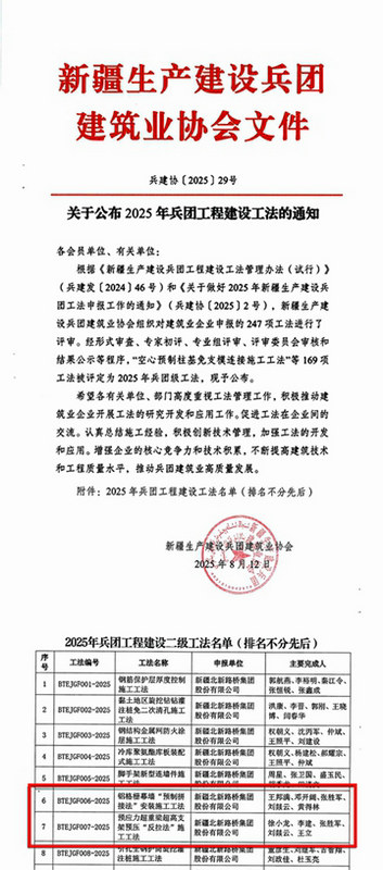 南平訊(通訊員 王立、王邦滿)近日,新疆生產(chǎn)建設(shè)兵團建筑業(yè)協(xié)會公布2025年度兵團級(省部級)工法成果,北新路橋集團福建分公司2項工法成功入選,至此該分公司本年度已累計有3項工法獲得省部級認證。