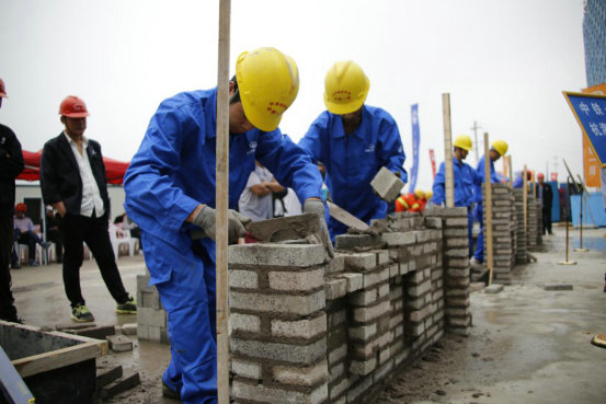 此次技能大比武要求參賽隊(duì)員采用梅花型、三一組砌法,在90分鐘內(nèi)砌筑一面有杭海城際鐵路logo的清水墻,砌筑工實(shí)際操作的能力達(dá)到內(nèi)實(shí)外美的要求。賽場(chǎng)上,參賽隊(duì)員們?nèi)〈u、抹灰、擺墻、扶正等動(dòng)作行云流水、一氣呵成,從砌筑工藝、外觀效果和穩(wěn)定性等方面展開激烈競(jìng)技,展示了砌筑工技能的高超水平。