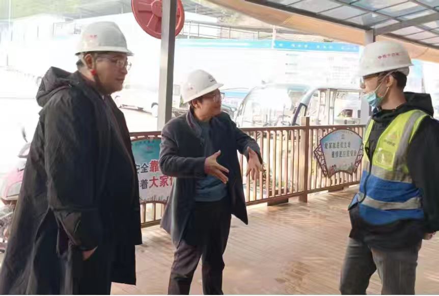 總承包部工程管理部副經(jīng)理唐天東(左2)現(xiàn)場解答技術(shù)疑問