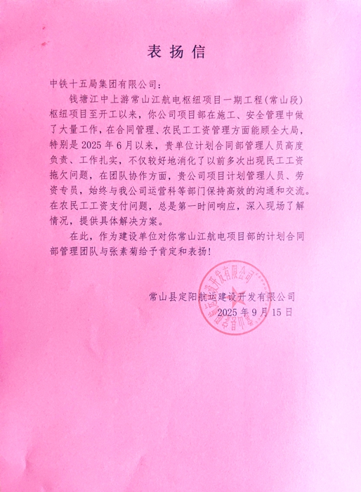 鐵路工程建設網(wǎng)訊 9月15日下午,中鐵十五局集團常山江航電樞紐項目收到常山縣定陽航運開發(fā)建設有限公司一份表揚信,贊揚該項目在勞務管理中作出的突出成績。