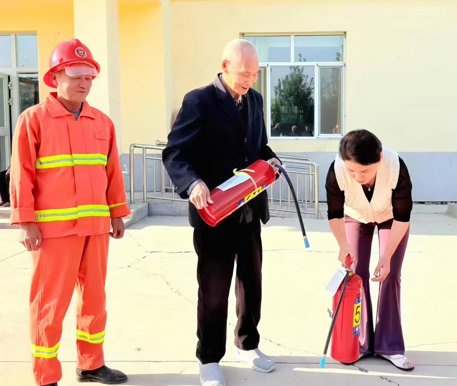 圖2為:六師奇臺110社區(qū)吾家樂寶養(yǎng)老院院長史云智(左二),在開展“雙節(jié)”消防逃生應(yīng)急演練滅火器實際操作培訓(xùn)中,正在檢查干粉滅火期是否完好。
