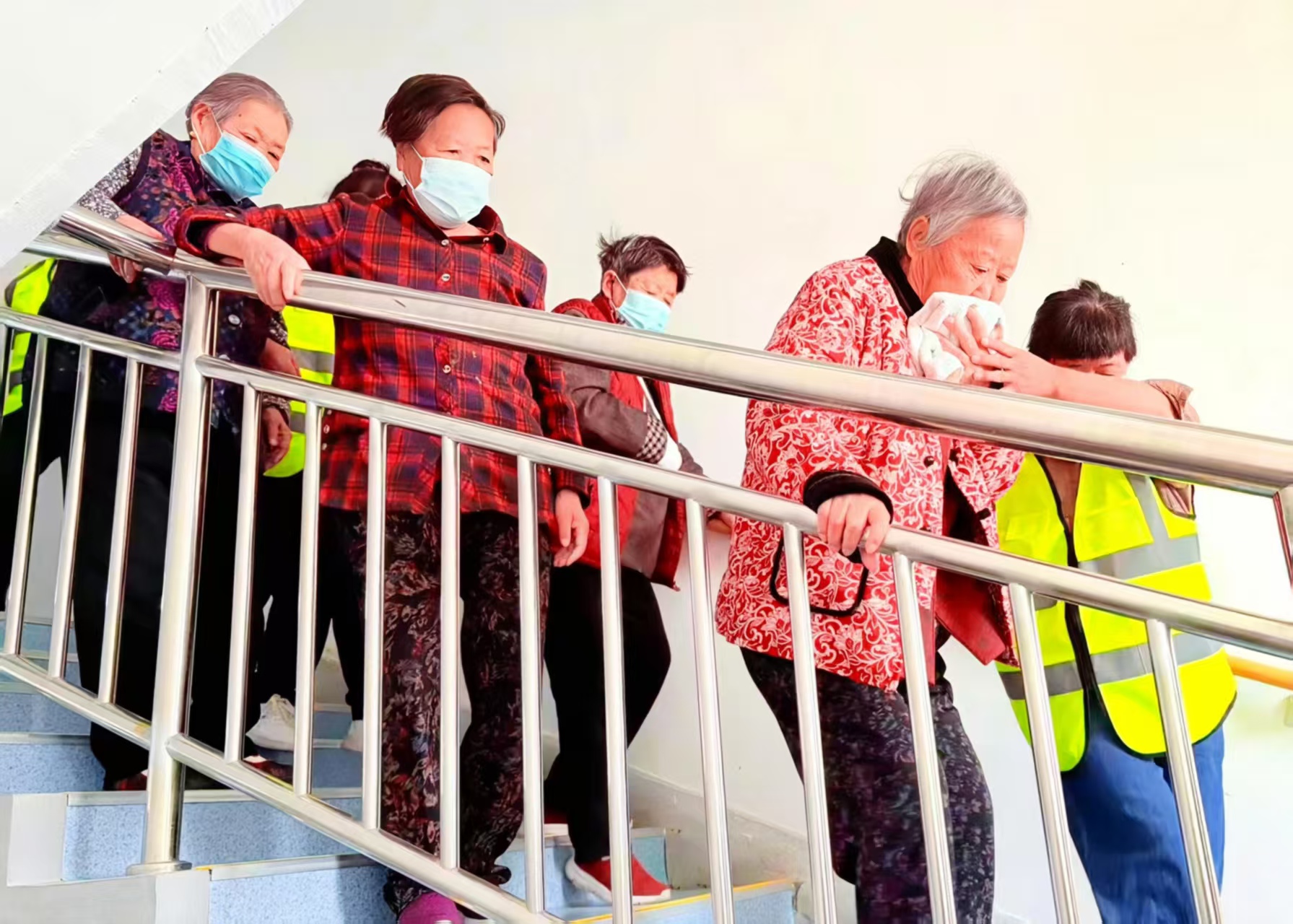 圖3為:在“雙節(jié)”逃生應(yīng)急演練中,該院應(yīng)急疏散組成員、護(hù)理員,正在按照消防火災(zāi)逃生預(yù)案,有序地組織長(zhǎng)者撤離到安全地點(diǎn)。