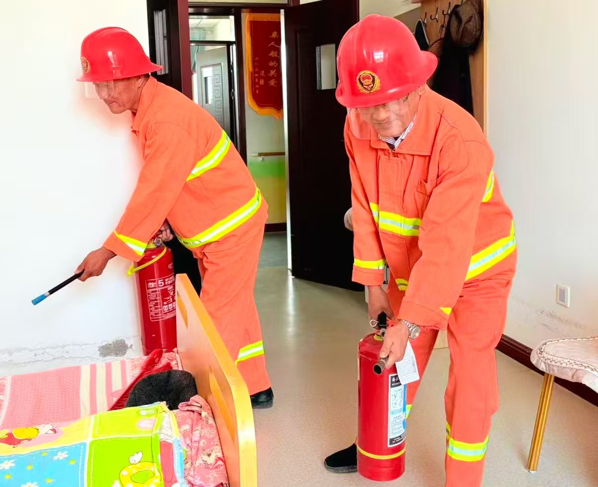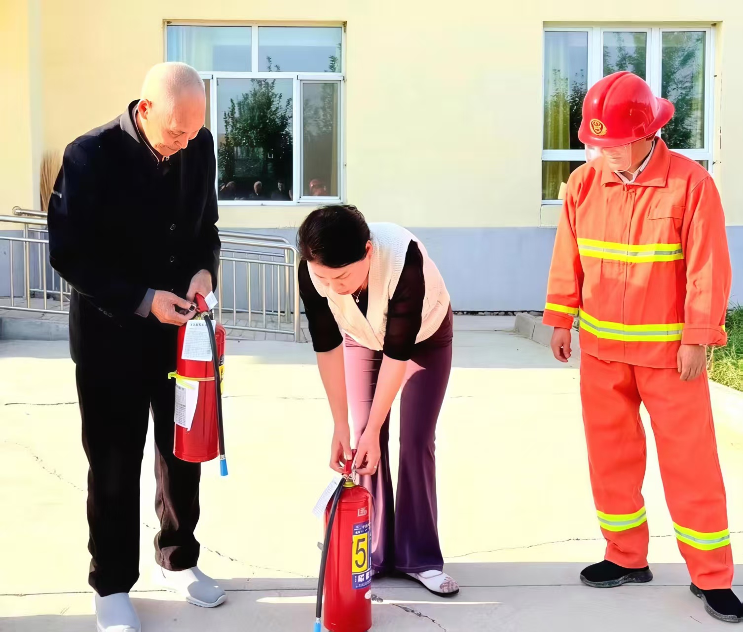 圖2為:六師奇臺(tái)110社區(qū)吾家樂(lè)寶養(yǎng)老院院長(zhǎng)史云智(左二),在開(kāi)展“雙節(jié)”消防逃生應(yīng)急演練滅火器實(shí)際操作培訓(xùn)中,正在檢查干粉滅火期是否完好。