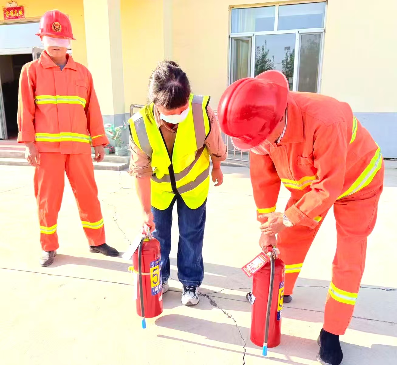 圖5為:該院安全員正在現(xiàn)場(chǎng)培訓(xùn)新員工正確操作干粉工滅火器。