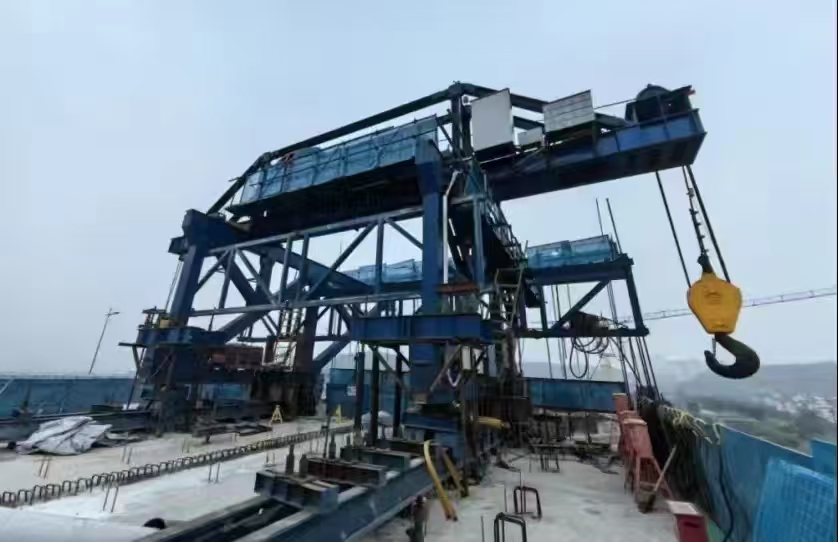 大橋采用鋼斜撐空腹連續(xù)剛構(gòu)的結(jié)構(gòu)形式,在國內(nèi)軌道交通橋梁建設(shè)中尚屬首例,鋼混混合式剛構(gòu)橋常規(guī)施工方法為先施工下弦鋼斜撐節(jié)段,后施工對應(yīng)的上弦混凝土節(jié)段,施工周期長,上下交叉作業(yè)安全風(fēng)險(xiǎn)高,且普通掛籃結(jié)合汽車起重機(jī)吊裝易受施工空間限制,經(jīng)濟(jì)性差。為研發(fā)“大橋掛吊一體裝置”關(guān)鍵技術(shù),總承包部副指揮長兼總工程師楊振在總承包部指揮長李兵、黨支部書記王向平等領(lǐng)導(dǎo)的重視支持下,他組織由中國鐵建重慶軌道交通15號(hào)線總承包部、中鐵建重慶投資集團(tuán)、重慶交通大學(xué)、中鐵建大橋局集團(tuán)三公司等單位聯(lián)合組成的科技研發(fā)團(tuán)隊(duì),圍繞“大橋掛吊一體裝置關(guān)鍵技術(shù)研究”課題立項(xiàng)研發(fā)。經(jīng)過團(tuán)隊(duì)探索研究,掛吊一體裝置在掛籃主桁架上方設(shè)置一臺(tái)吊機(jī)形成吊裝系統(tǒng),吊裝系統(tǒng)包含天車及吊具系統(tǒng),可用于下弦鋼斜撐吊裝施工;通過對掛籃的改進(jìn),同時(shí)滿足上弦箱梁和下弦鋼斜撐施工。