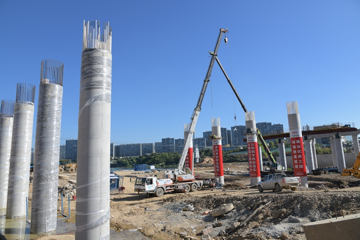 富足山舊橋位于城區(qū)文峰路上,全長(zhǎng)300米、寬18米、高19米,運(yùn)行30年,是常山縣33.6萬(wàn)人出行,與杭州、江西上饒等地密切聯(lián)系的重要通道,被當(dāng)?shù)厝朔Q為民生橋。新建富足山大橋在舊橋原址上,與天馬樞紐泄洪閘相距約30米,橋墩和橋面橫跨導(dǎo)流墻。該橋全長(zhǎng)376.8米、11垮、高19米、寬27.5米,直徑1.5—1.8米的樁基46根,直徑1.7米的墩柱42個(gè),9、10垮為通航通道,上部為T梁結(jié)構(gòu),橋面兩側(cè)各增加2.75米寬的人行道和3米寬的非機(jī)動(dòng)車道。2024年11月開(kāi)工建設(shè)。該項(xiàng)目在樁基施工中,利用冬春雨水少的特點(diǎn),從兩端向中間推進(jìn),為橋墩施工創(chuàng)造了條件。今年汛期過(guò)后,項(xiàng)目部建起一座100多米長(zhǎng)的漫水橋,右側(cè)5排20根墩柱和蓋梁完成后,填筑起一座6米多高的圍堰,將常山江水改變流向,從完工的墩柱位置流過(guò),抽干左側(cè)河道的積水,組織人力和機(jī)械進(jìn)行樁基施工。在墩柱施工中,采取在破樁頭后的樁基上綁扎鋼筋籠、安裝定型鋼模、一次性灌注的辦法,使拆模后的墩身顏色一致、光潔如玉,受到業(yè)主、監(jiān)理單位的好評(píng)。
