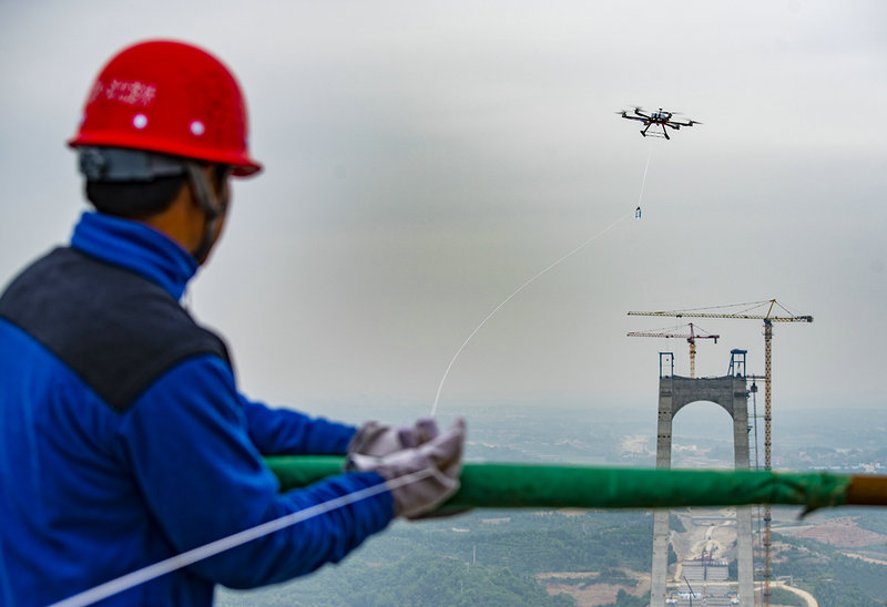 此次先導(dǎo)索采用直徑2.0毫米、長1760米的高強度高韌性杜邦絲,由GPS自控導(dǎo)航式無人機攜帶,待起飛指令發(fā)出后,“飛手”操控?zé)o人機從南索塔156米高的塔頂起飛,飛躍1038米寬的長江,歷經(jīng)5分鐘,飛至北索塔148米的主塔塔頂,成功連接長江兩岸。先導(dǎo)索過江完成后,將以此索為基礎(chǔ),采用“小繩拉大繩”方式,通過來回8次拖拽,逐漸增加鋼繩重量,形成貓道主牽引系統(tǒng),最后進行貓道的安裝與主纜索股架設(shè)施工。