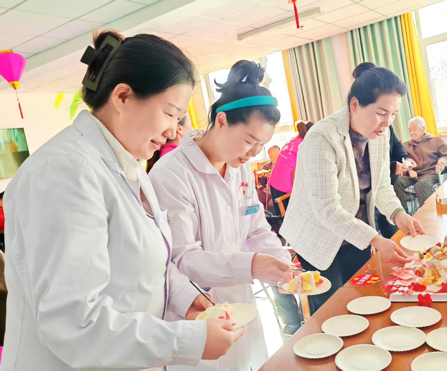 圖2為:三十里大墩醫(yī)療服務中心醫(yī)務人員,與六師奇臺農(nóng)場110社區(qū)吾家樂寶養(yǎng)老院院長史云智(左一),在李文生老爺爺?shù)?ldquo;百歲生日會”中,為該院在院長者們分享生日蛋糕。